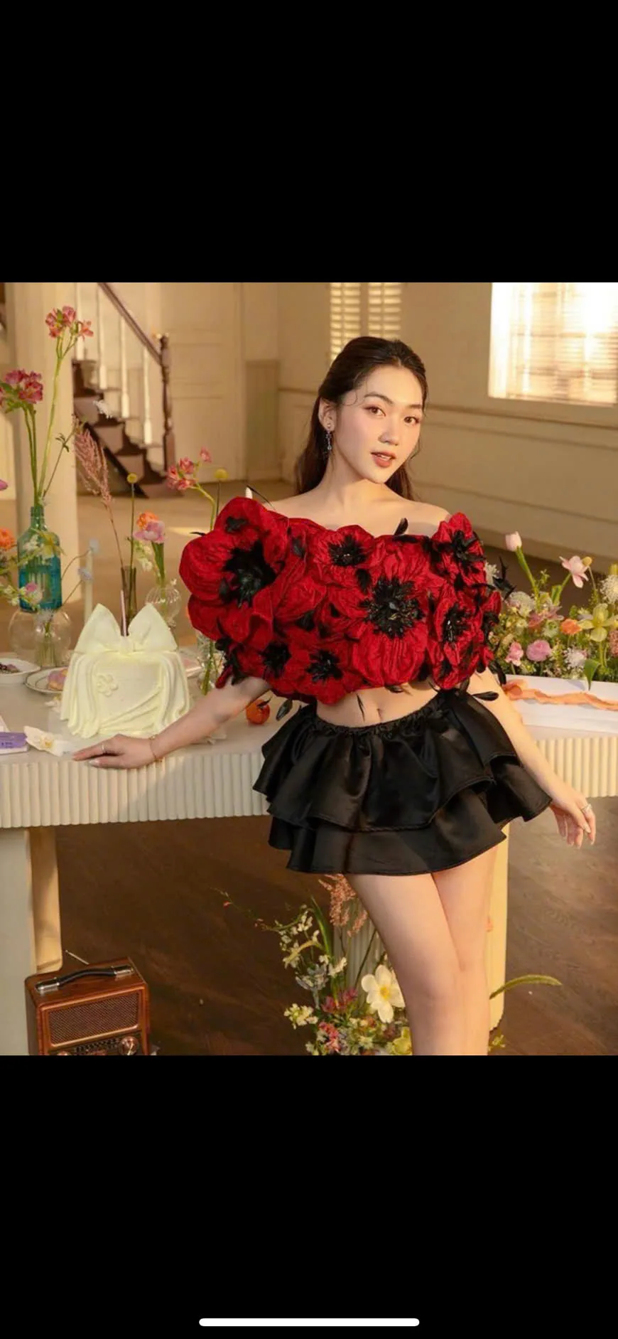 Áo hoa trễ vai, croptop
