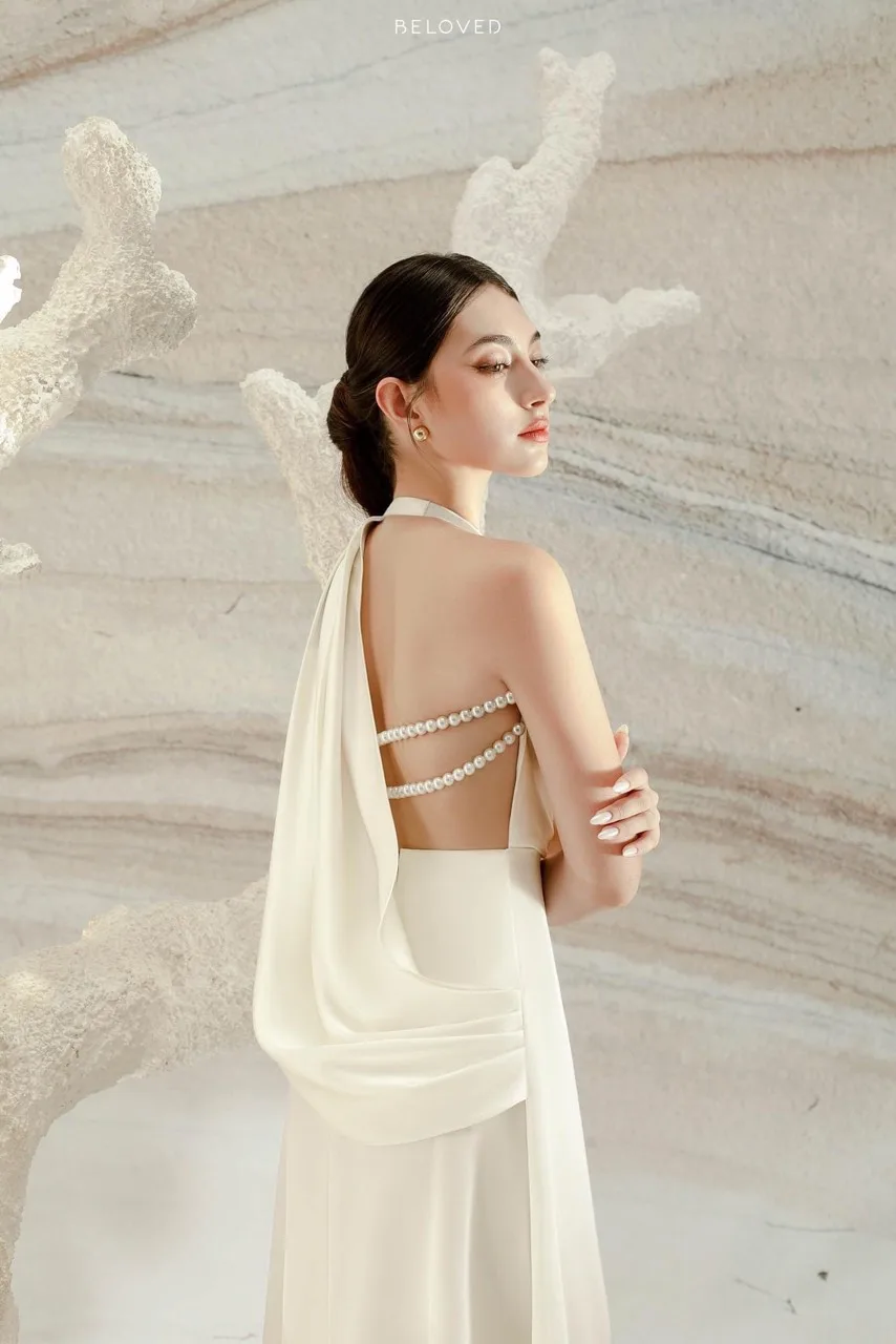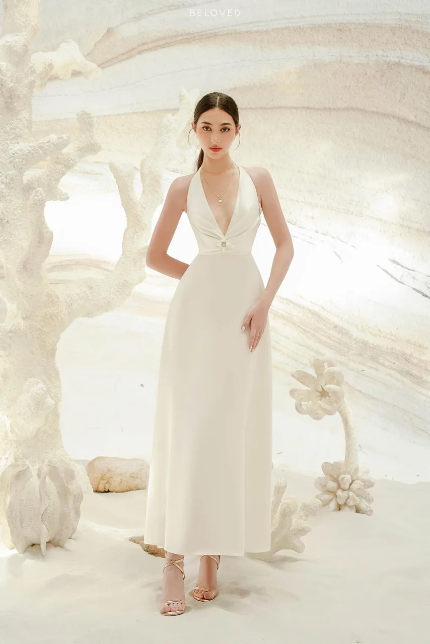 Đầm lụa liền xòe cổ khoét V hở lưng