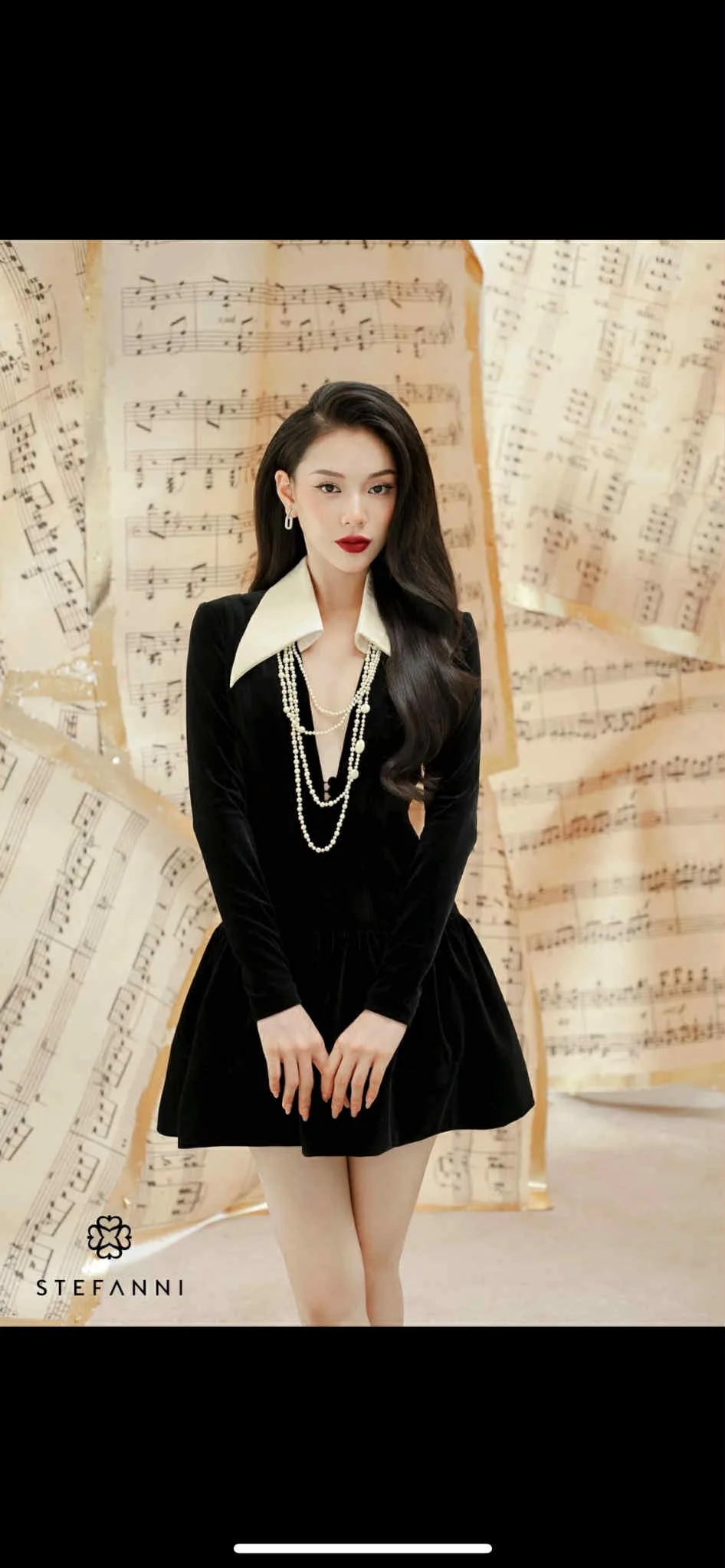 Váy đen nhung ngắn có cổ, tay dài
